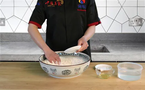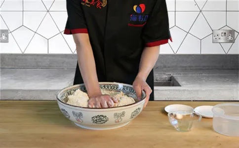 把膨松剂加入面粉中,适当混匀。把食盐溶解在和面水中。把溶有食盐的水倒入面粉中,把加水后的面粉和成表面比较光滑的面团。把揉好的面团盖上盖,静置醒发。为了使醒面效果好一般需要多揉一到二次的面,隔时间大约8-10分钟。